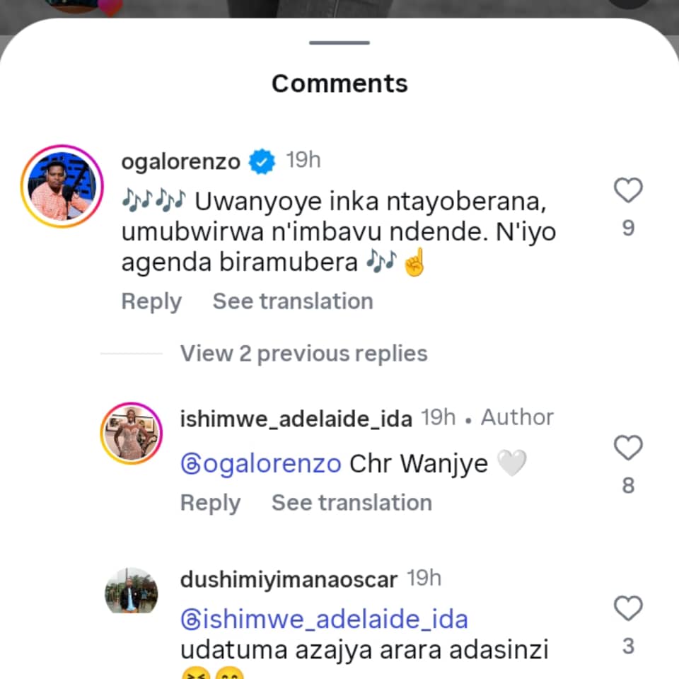 Ubu butumwa bwaba bombi butangajwe nyuma y’ubwo ku cyumweru tariki ya 14 Nzeri 2025, aho Ida na bwo yari yasangije abamukurikira kuri Isitogarame barengagaho gato ibihumbi 36 amafoto 2, icyo gihe na bwo Lorenzo yaciye ahatangirwa ibitekerezo muri(Comments) atera imitoma ihogoza Ida, agira ati “Uwanyoye Inka ntayoberana, umubwirwa n’Imbavu ndende, N’iyo agenda biramubera.”