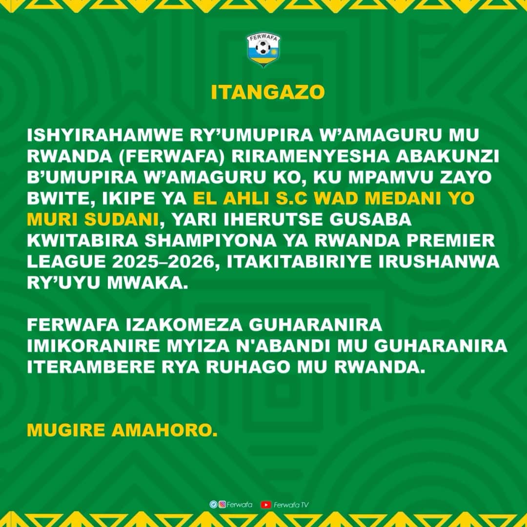 Mu gitondo cyo kuri uyu wa kane tariki 10 Ukwakira 2026 Ishyirahamwe ry’Umupira w’Amaguru mu Rwanda(FERWAFA) ni ho ryasohoye itangazo rivuga ko ikipe ya Al Ahli SC Wad Madani itacyitabiye Shampiyona y’u Rwanda nk’uko yari yabisabiye.