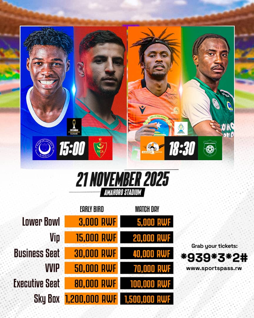Umukino wa Gasogi United uzaba sa 18:30 mu gihe hazaba habanje uwa Al Hilal Omdurman na MC Alger saa 15:00, kugura itike imwe biguhesha amahirwe yo gukurikira imikino yombi.
