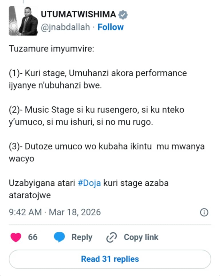 Minisitiri w’Urubyiruko n’Iterambere ry’Ubuhanzi, Dr. Utumatwishima Jean-Népo Abdallah, yamenyesheje abanenze imyambarire y’umuhanzi Doja Cat ko urubyiniro rw’umuziki atari urusengero cyangwa se Inteko y’Umuco.