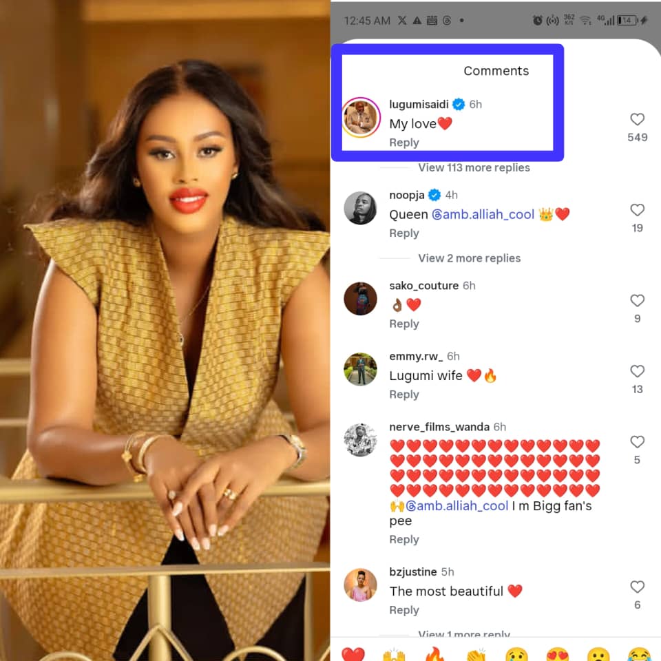 Said Lugumi yaje kuyica umurya ubwo yacaga ahatangirwa ibitekerezo ku mafoto Alliah Cool yari amaze gusangiza abamukurikira kuri Istogram maze Lugumi yandika ati ‘Rukundo rwanjye’.